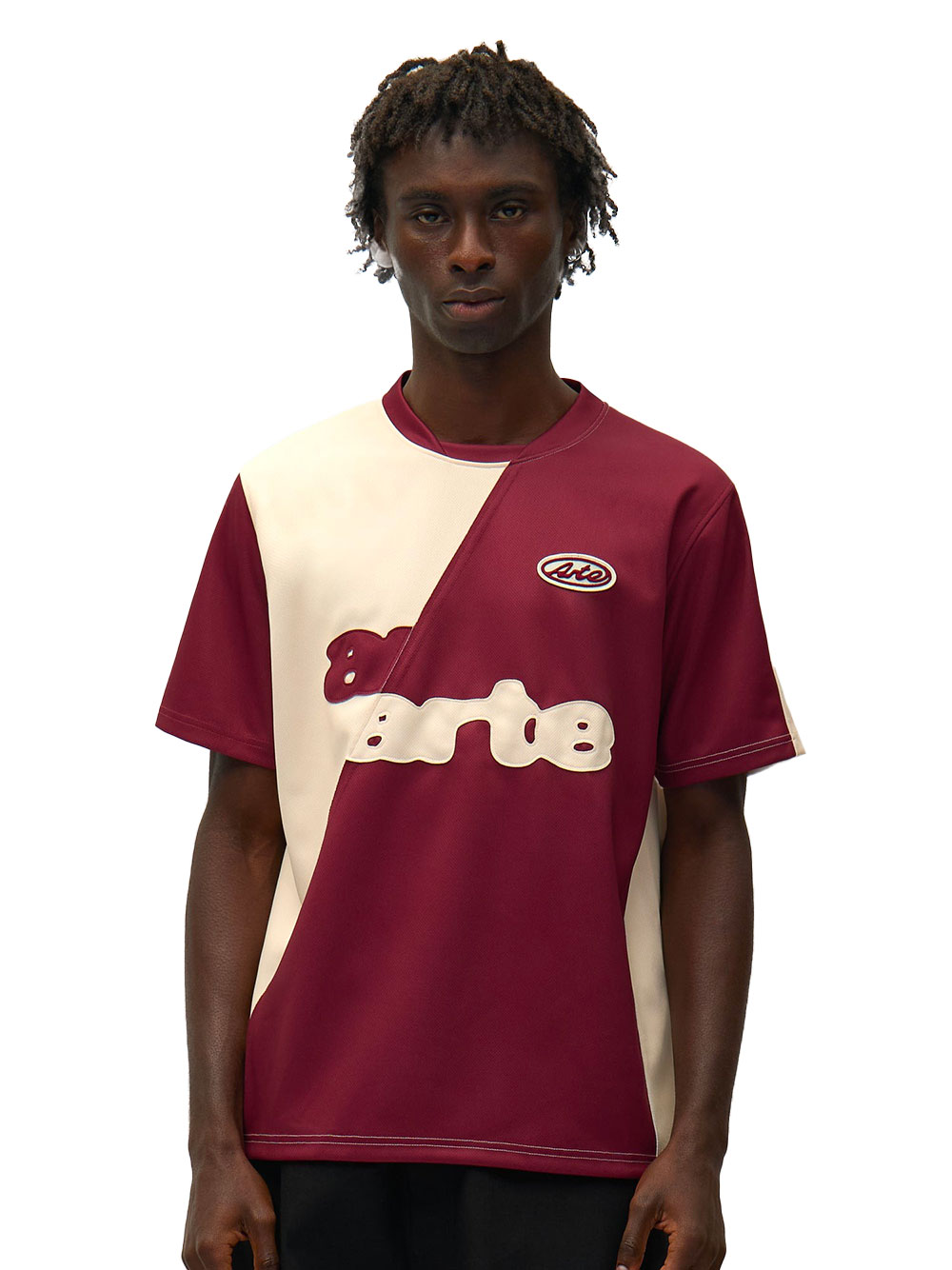 Le T-shirt Football Bordeaux Cream de Arte Antwerp revisite l’esthétique du maillot sportif avec un design graphique moderne. Léger et respirant, il apporte une touche dynamique à un look urbain.
