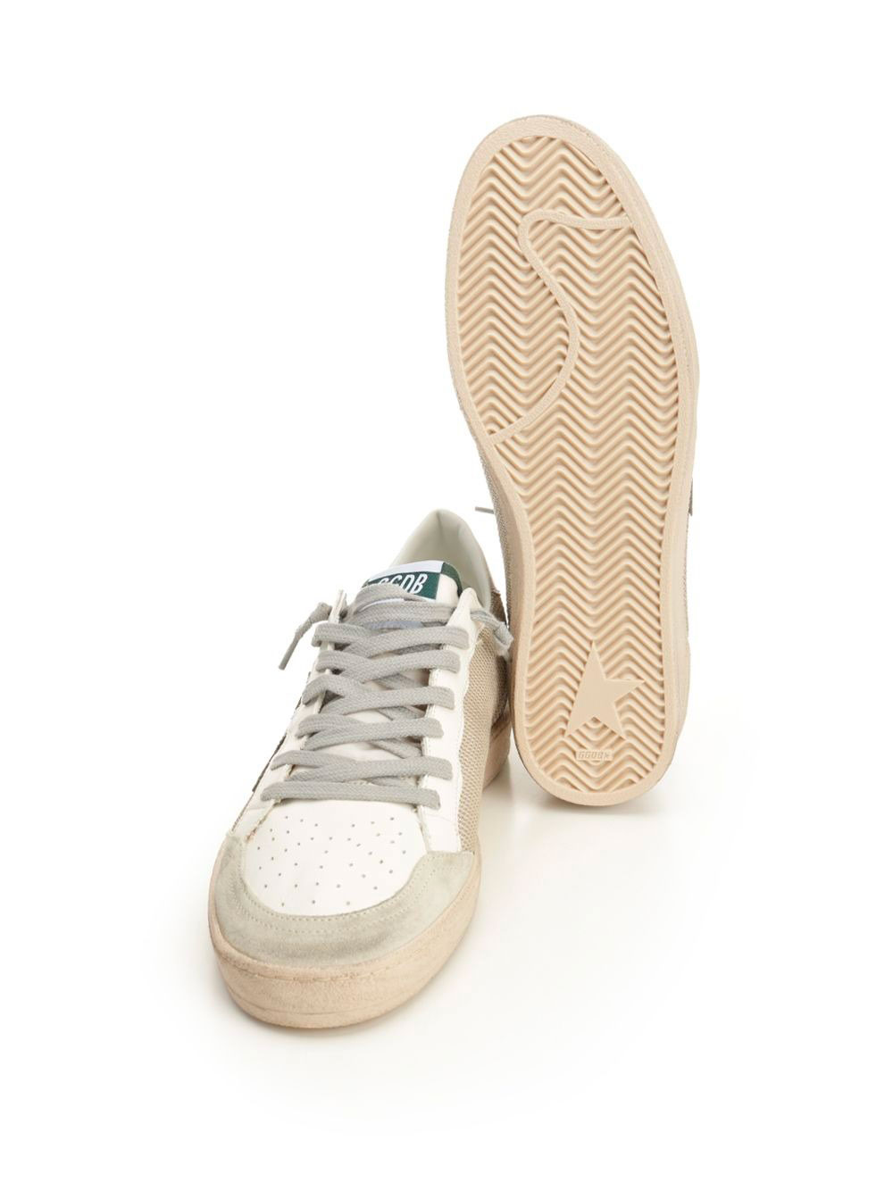 Blanc, cuir de veau, effet usé, bout rond, bout perforé, languette à patch logo, fermeture à lacer sur le devant, patch étoile signature, logo imprimé à l’arrière, semelle plate.
