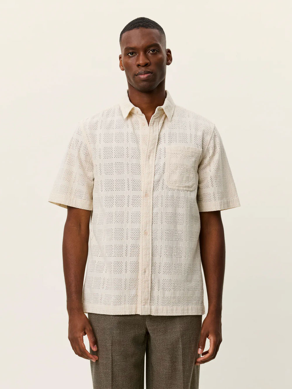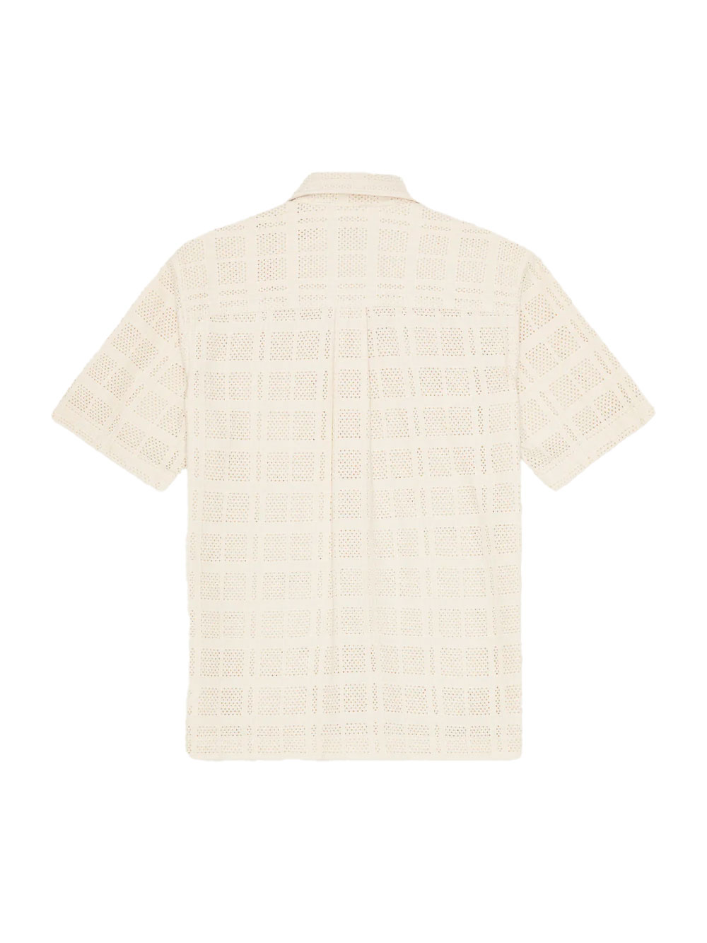Chemise à manches courtes en broderie anglaise en coton, avec un motif ajouré respirant. Elle est pourvue d’une poche poitrine et d’un ourlet droit.