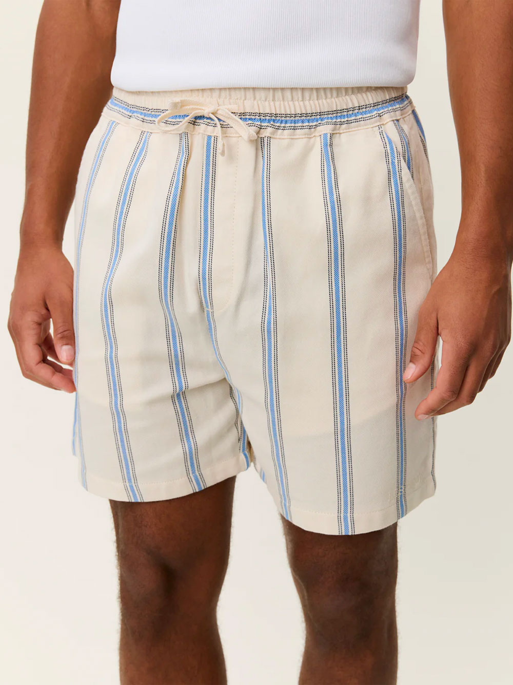 Le style se distingue par ses rayures classiques et son allure subtile, tout en restant sobre et versatile. Le coton sergé offre un toucher agréable et une tenue légère, idéale quand les températures montent. La coupe regular et la taille élastiquée avec cordon de serrage assurent un confort optimal et un ajustement personnalisé, sans contrainte.