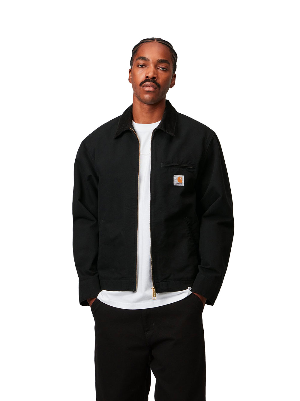 Veste Detroit Jacket noire “Rinsed” de Carhartt WIP, en coton biologique lourde, coupe unisexe, col en velours côtelé et fermeture zippée pour un style workwear minimaliste.