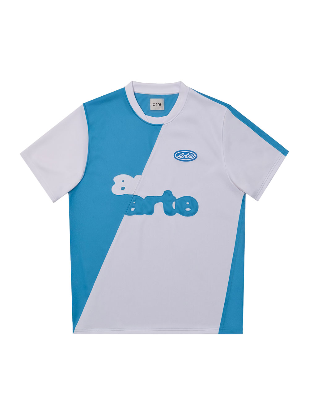 This Arte Antwerp t-shirt draws inspiration from sports jerseys with a two-tone blue and white graphic design. The Arte logo applied to the chest reinforces the modern and creative identity of the Belgian brand.
