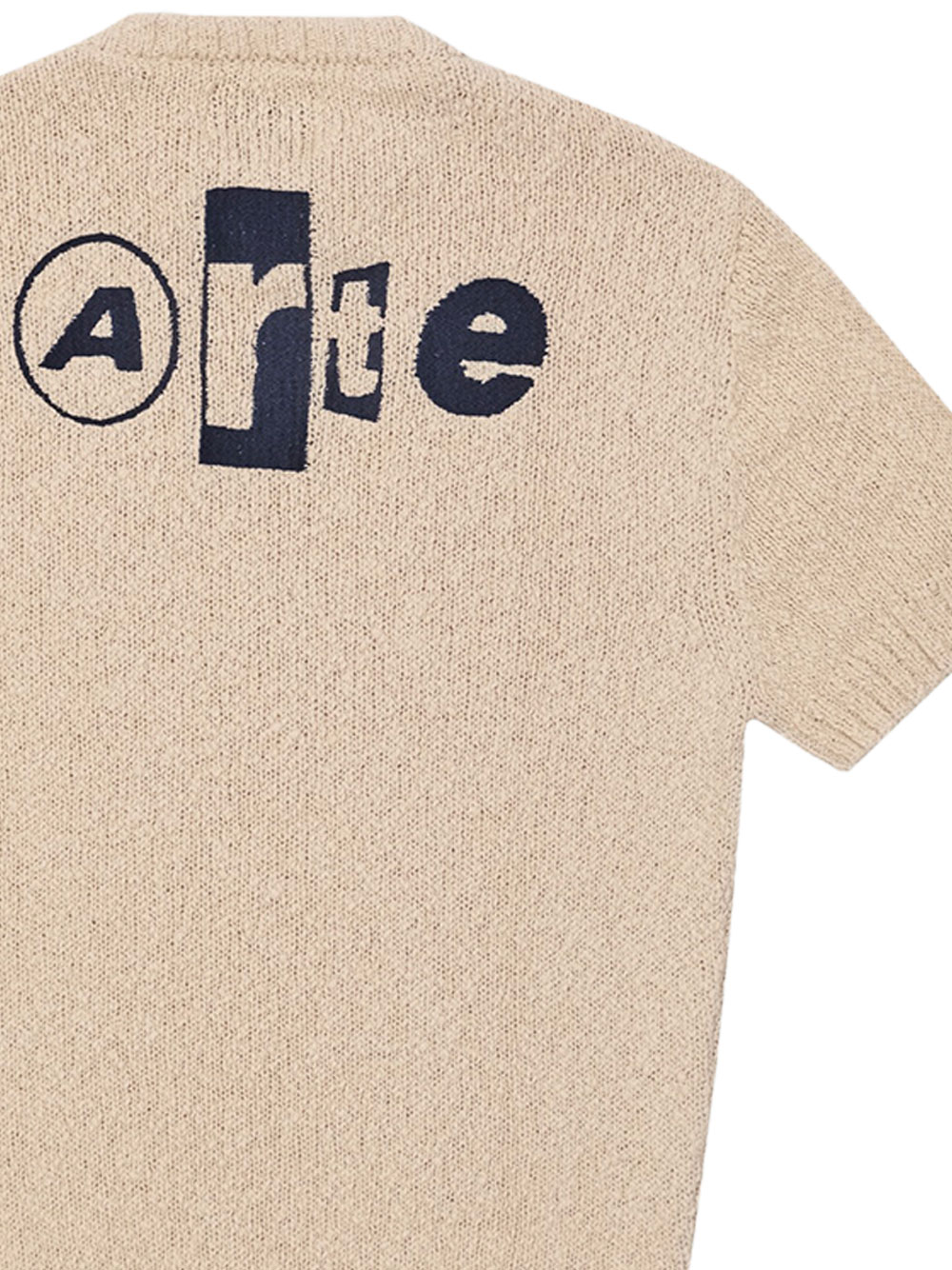 The Back Graphic Knit T-shirt – Cream by Arte Antwerp is a 100% cotton knit T-shirt with a graphic pattern on the back, combining comfort, urban style and modern visual identity.