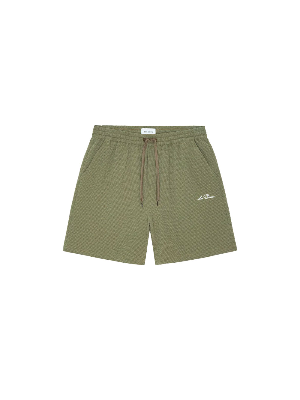 Its textured waffle fabric adds a striking visual touch while remaining understated. The elasticated waist with drawstring ensures a secure fit and optimal comfort, while the balanced cut offers natural freedom of movement. The small embroidered detail on the front adds a subtle signature to the design.