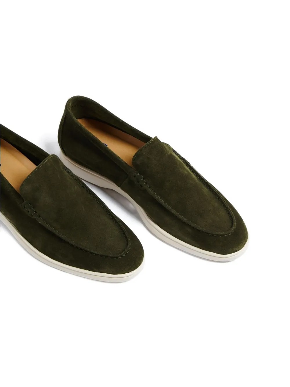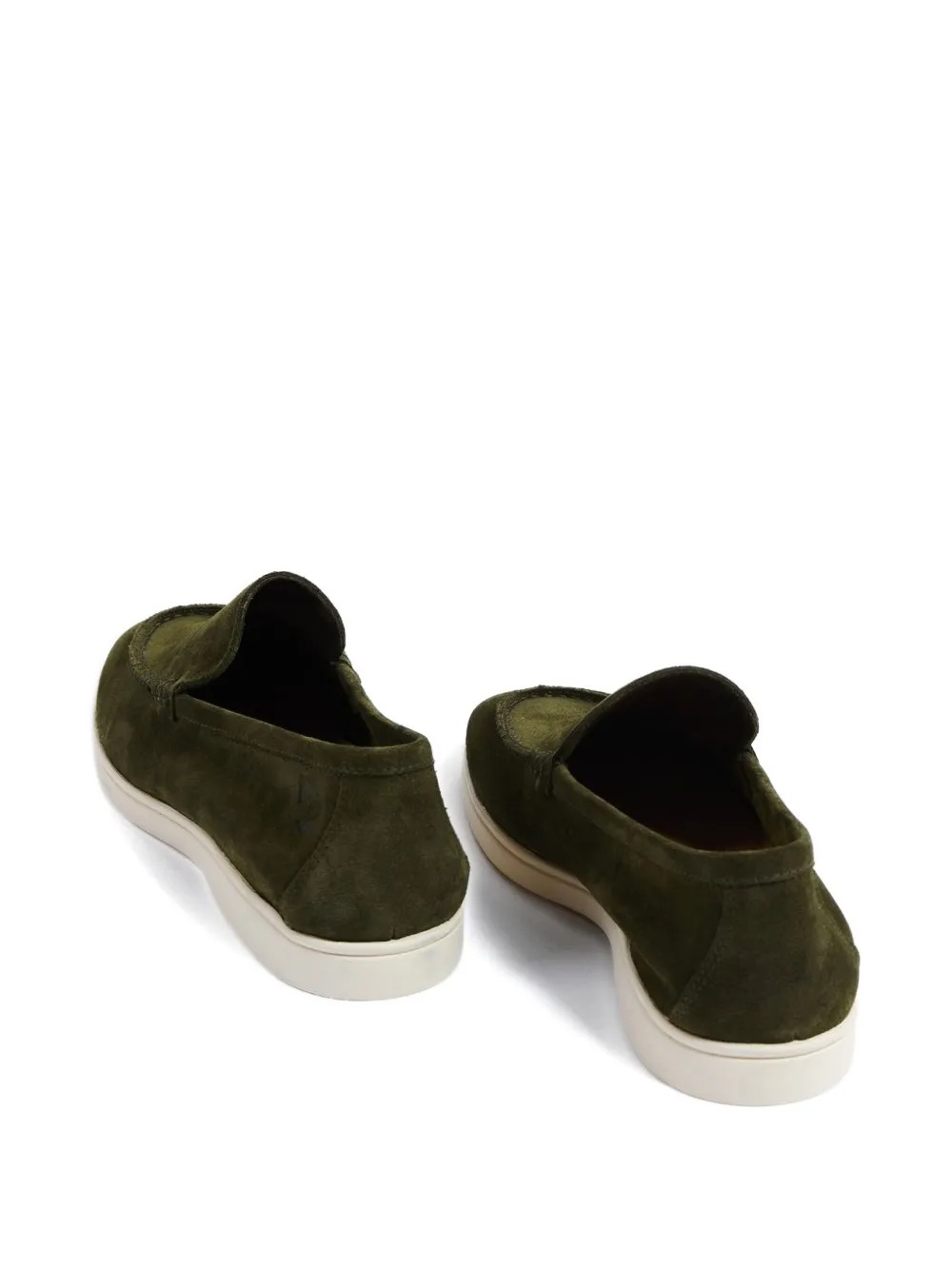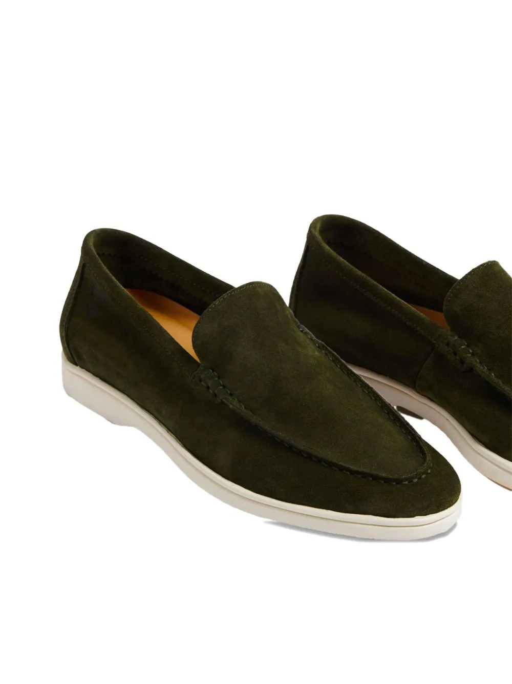 - Flat slip-on shoes in khaki green suede with topstitching and almond toe.